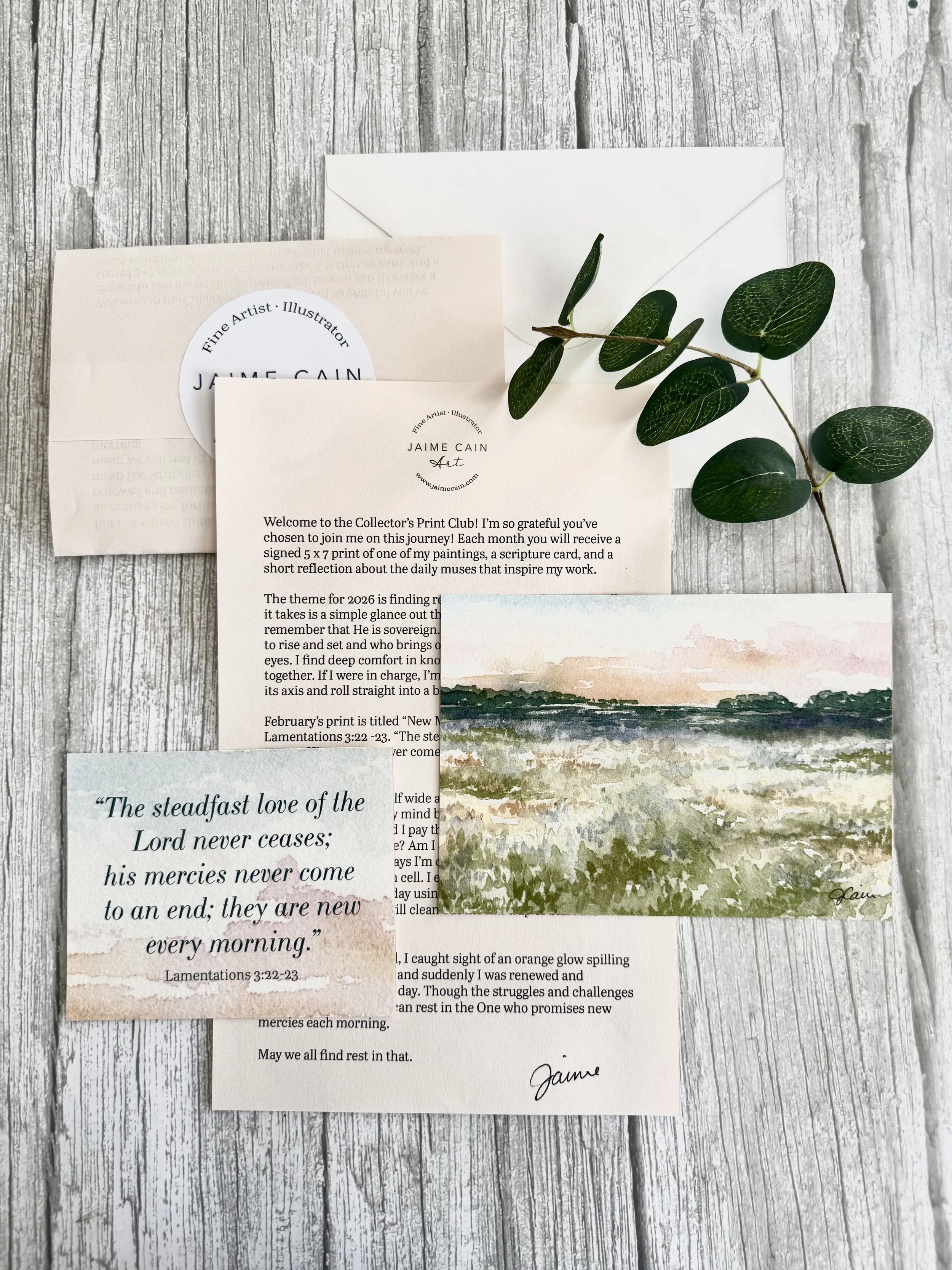The Jaime Cain Collector’s Print Club is a special membership designed for collectors, art lovers, and anyone who wants to receive meaningful artwork paired with encouragement each month. This subscription is more than a print delivery. It is a rhythm of beauty, faith, and connection delivered right to your mailbox.