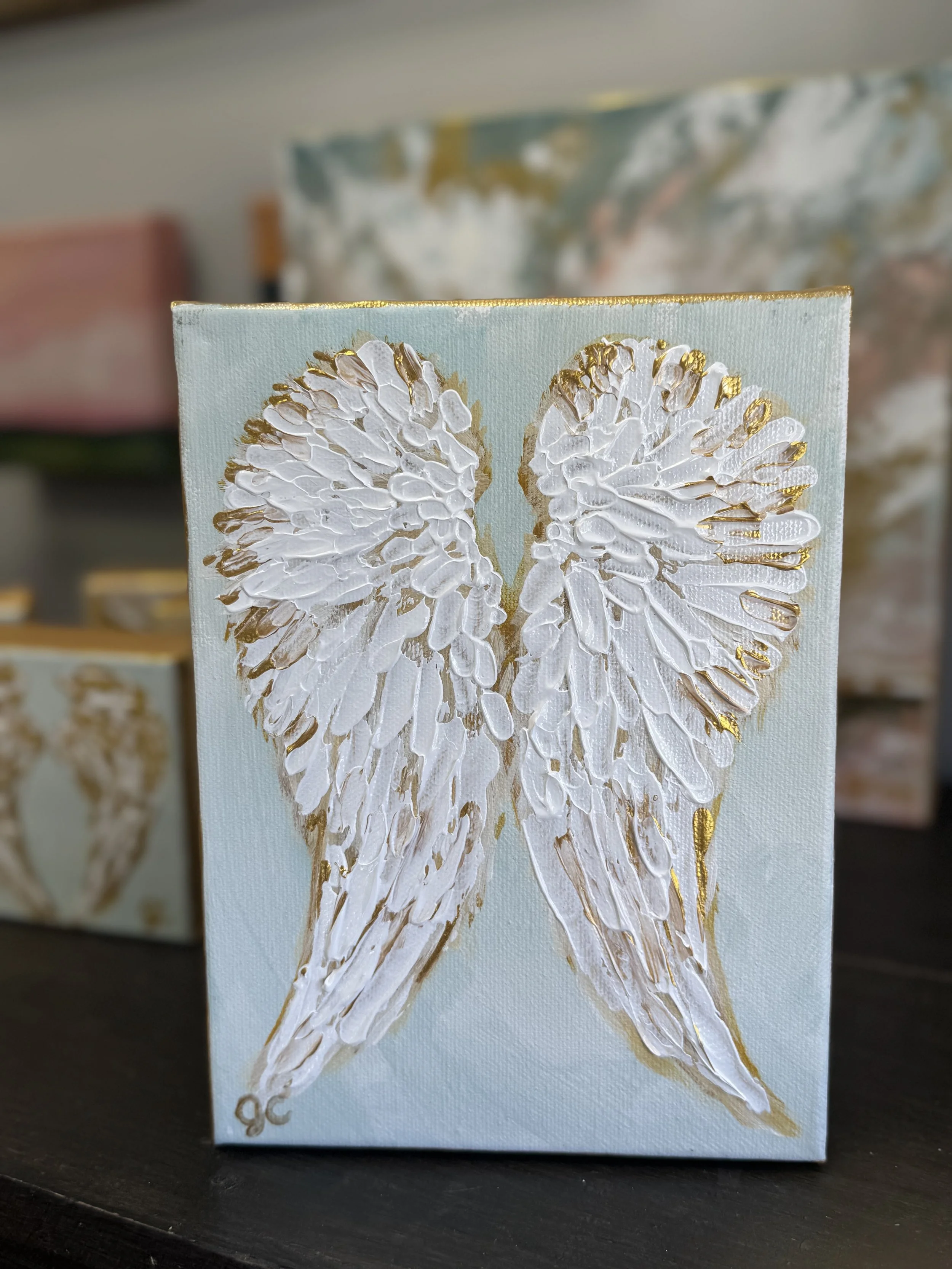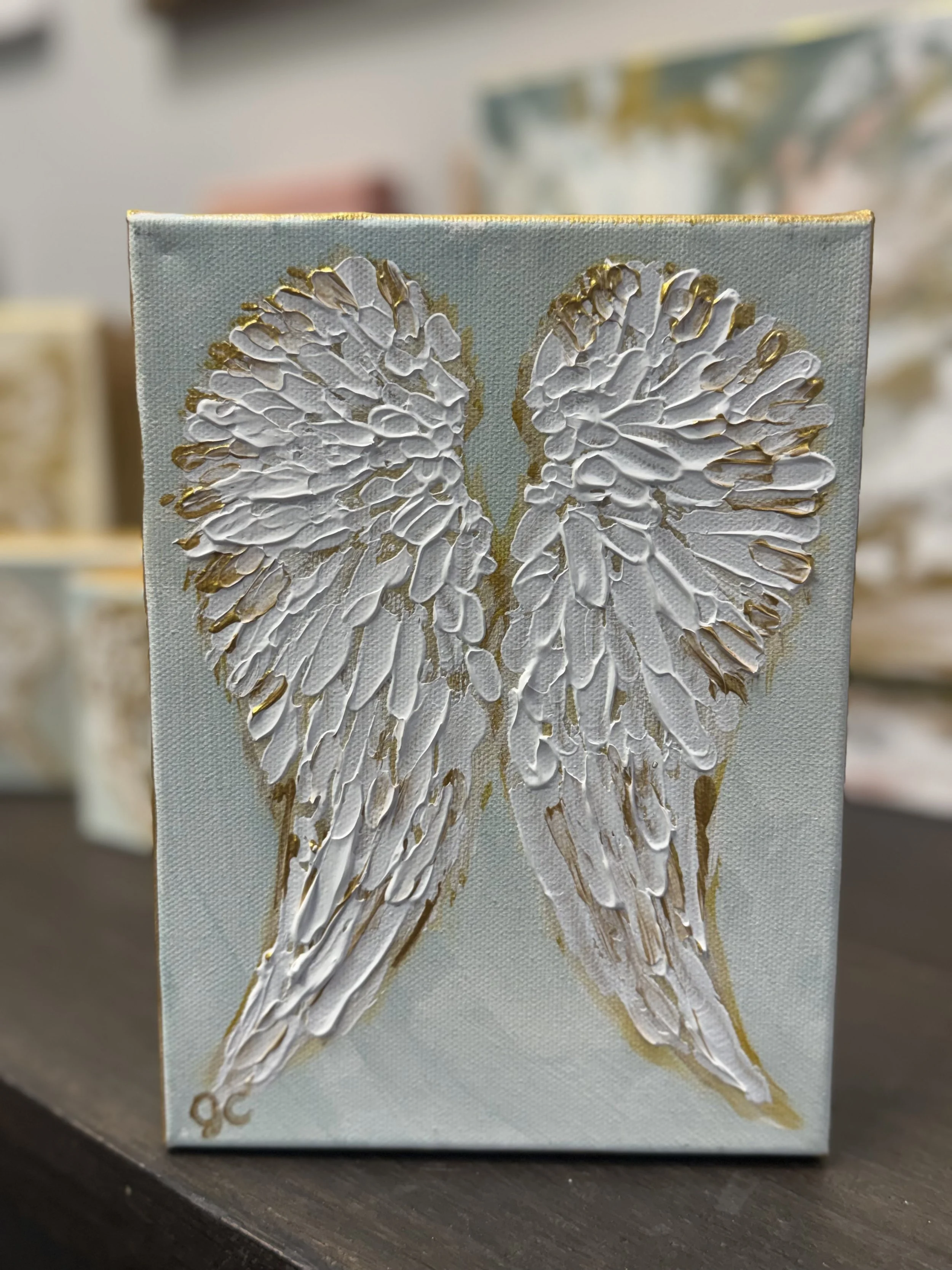 “Gold Angel Wings” is an acrylic on canvas original painting measuring 6 × 8 inch. From my Heaven’s Gate series, this piece captures a glimpse of God’s glory through soft, radiant wings. Created as part of my ongoing exploration of faith and the divine, it’s a small but powerful reminder of heaven’s nearness and hope.