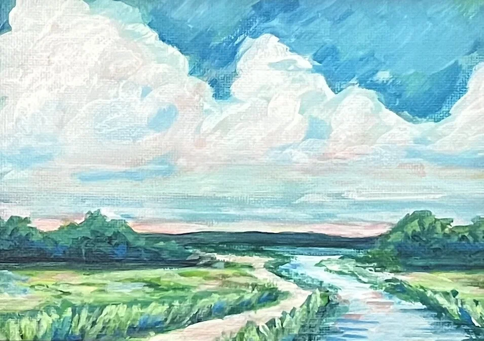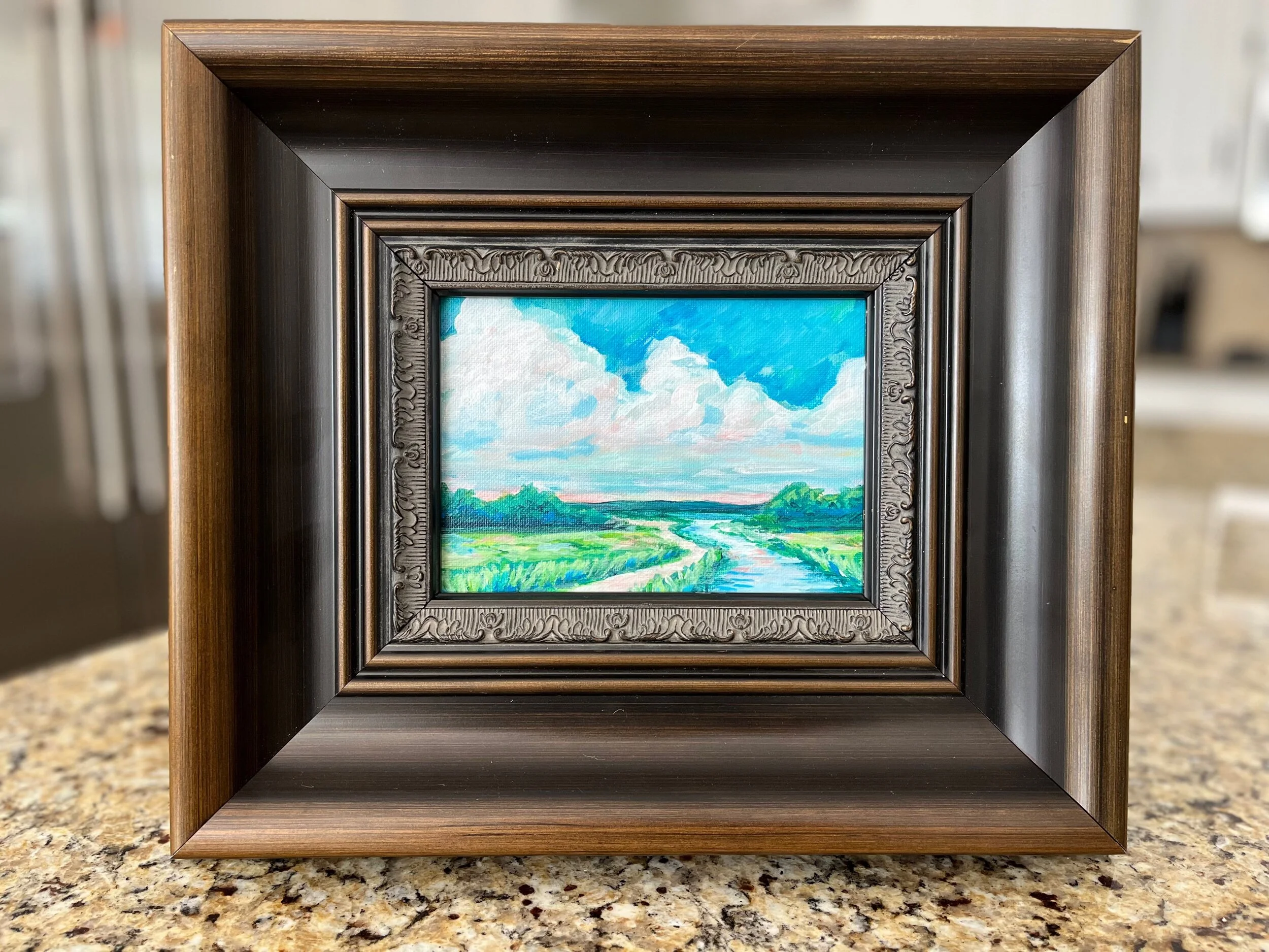 Pink Marsh. 5 x 7 inch acrylic on canvas panel. Frame included.